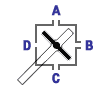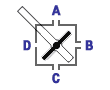 A picture of a pneumatic switch is shown below along with two block diagrams of it. The first diagram shows the lever in the up position. In this position, the B and C tubes are connected together and the A tube is open. The D tube shown in the diagram is not visible in the real switch. With the lever in the down position, the A and B tubes are connected together and the C tube is open.