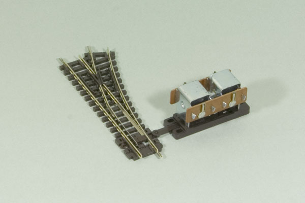 The motor has three pairs of tabs that can be slid into slots and bent to hold it in place. Depending on the mounting option, one set may have to be bent out of the way. The motor can be directly mounted on any Peco HO or N turnout or the PL-12 adapter. The tabs on the motor slide into slots in the turnouts. The pin on the motor slides into a hole in the sliding part in the turnout or turnout adapter.