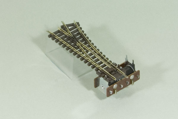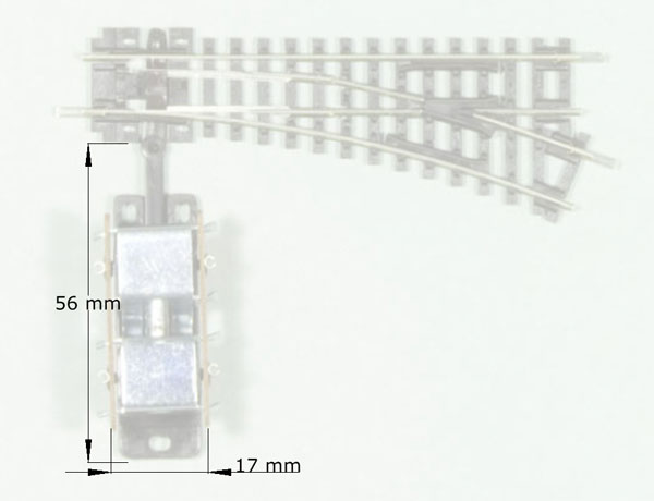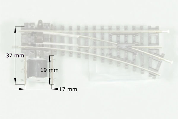 Mount the point motor directly on the turnout. The Peco turnouts have slots to mount the motor off-centre. The motor does not have to work hard with only the spring in the turnout to work against. A big hole (40 x 25mm) has to be cut into the baseboard and the motor still sticks out below the surface by 20mm. If the pin sticking out underneath is not trimmed, that amounts to 26mm. The footprint is small with the offset mount contributing 19mm. Depending on the space constraints, the motor can be offset on either side. There is very little to disguise, especially if the tabs not used are bent down.